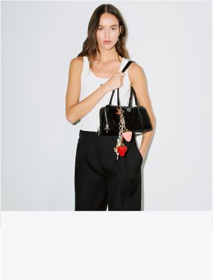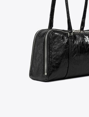 Soft and lightweight, our Small Crinkle Leather Marshmallow Satchel has a ’90s-inspired shape. The double-zip silhouette carries a lot and keeps things organized. Carry it over the shoulder by its slim straps or hugged as an oversized clutch. Finished with ball-and-chain pulls and a subtle embossed metallic Double T.