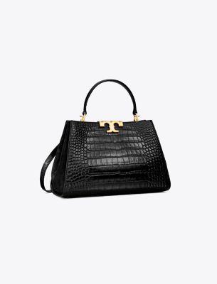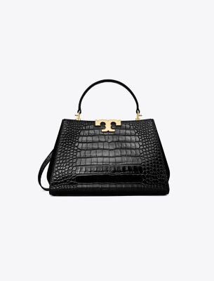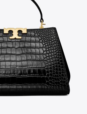 Against clean, structured lines, the bold curves of Double T hardware. The Eleanor Satchel is made of croc-embossed leather with hand-painted edges. A jewel of craftsmanship, designed to carry with ease. Carry by the top handle or removable crossbody strap.