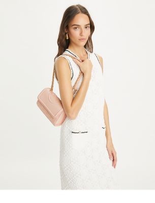 The Small Fleming Convertible Shoulder Bag with framed diamond quilting and an embossed Double T. It is crafted in a super-fine grain calfskin for a smooth, luxurious feel, durability and high scratch-resistance. The adjustable chain strap, laced with leather, can be worn doubled over the shoulder or long and crossbody.