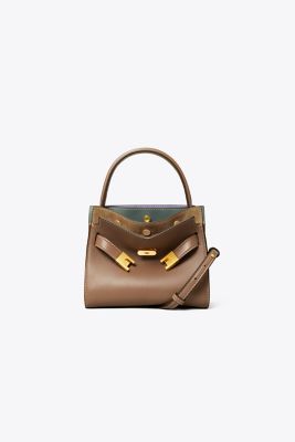 Editors&rsquo, favorite: Our Lee Radziwill Petite Double Bag contrasts structure and softness, and a mix of materials. Composed of layers that unfold like the collar of a trench coat, it can be worn opened, semi-buttoned or fully closed. Beautifully crafted in leather and suede, with signature lock-and-key hardware and an optional crossbody strap. The collection is named for Lee Radziwill, a woman Tory always admired &mdash, she was fearlessly unique.