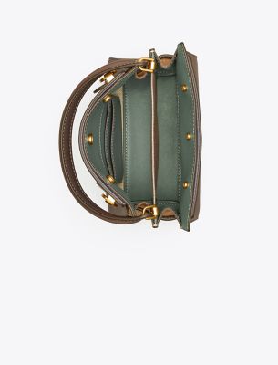 Editors&rsquo, favorite: Our Lee Radziwill Petite Double Bag contrasts structure and softness, and a mix of materials. Composed of layers that unfold like the collar of a trench coat, it can be worn opened, semi-buttoned or fully closed. Beautifully crafted in leather and suede, with signature lock-and-key hardware and an optional crossbody strap. The collection is named for Lee Radziwill, a woman Tory always admired &mdash, she was fearlessly unique.