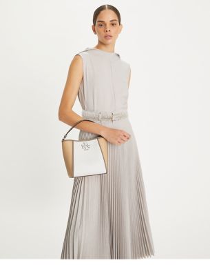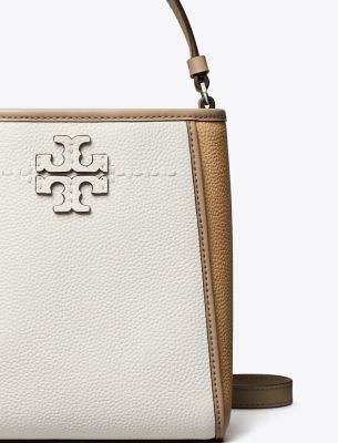The small McGraw Colorblock Bucket Bag is made of pebbled leather, with a die-cut Double T and pick stitching, sewn by hand. Carry it two ways by the top handle or crossbody strap.