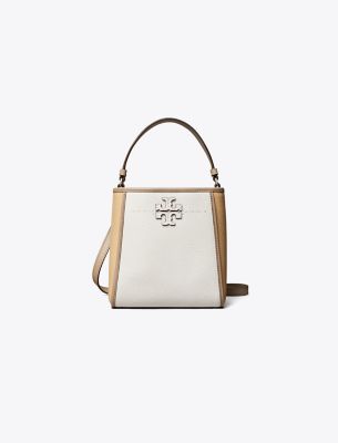 The small McGraw Colorblock Bucket Bag is made of pebbled leather, with a die-cut Double T and pick stitching, sewn by hand. Carry it two ways by the top handle or crossbody strap.