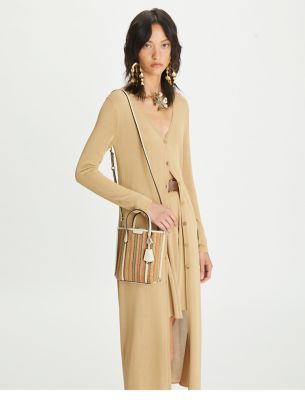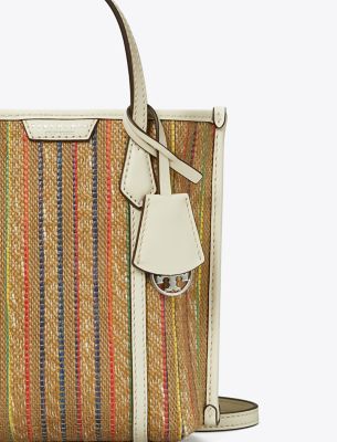 Minimal hardware on a new streamlined silhouette, now in striped woven raffia trimmed in leather. Designed to hold the essentials, our Mini Perry Tote Bag has a center compartment and a removable crossbody strap.
