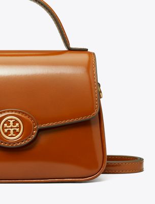 A collection named for Tory’s parents, Buddy and Reva Robinson. Inspired by their love of travel, the timeless and versatile silhouettes are designed for everyday use. The Small Robinson Top-Handle is made of beautiful spazzolato leather with smooth rounded edges. Carry it by hand or wear it with the removable crossbody strap.