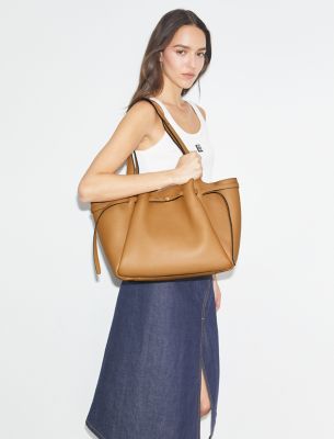 The Romy Tote is crafted in soft pebbled leather with a gently gathered silhouette. The ultimate everyday handbag, it is lightweight with a spacious interior organized with a deep zip pocket. Detailed with a slim belt and our new button logo. The tote, which can double as a carry-on for travel, has a wide shoulder strap for comfort.