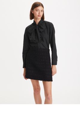 A style we reinvent every season. Our scalloped bow blouse is made of cotton with mother-of-pearl buttons. Wear it alone or layered under a cardigan, with the neckties left loose or tied in an off-kilter knot.