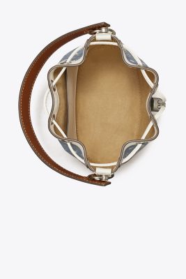 The bucket bag is trimmed in fine leather. When worn crossbody, the top handle falls naturally. Our metal logo cord stopper works as a keeper for the drawstrings. Press and hold the Double T down while guiding the drawstrings through — and release to lock. Lined in soft microsuede, the interior has a pocket for organization, while an exterior sleeve puts small items within reach. Every detail is considered, with special attention to function and versatility.