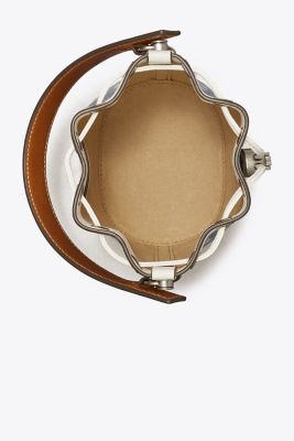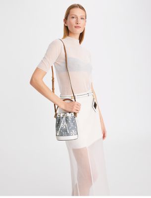T Monogram is a classic pattern inspired by traditional Pennsylvania Dutch quilting. Meticulously crafted in denim jacquard, the collection speaks to the timelessness of great style. The mini bucket bag closes with drawstrings secured by our gold Double T cord stopper. Worn crossbody, the top handle falls naturally. Every detail is considered, with special attention to function and versatility.