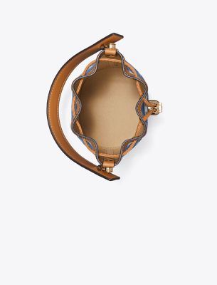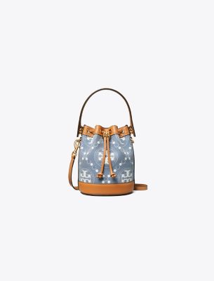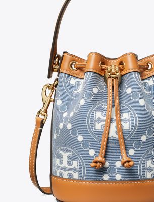 The T Monogram mini bucket bag closes with drawstrings, secured by our gold Double T cord stopper. Worn crossbody, the top handle falls naturally. Every detail is considered, with special attention to function and versatility, including interior and exterior pockets.