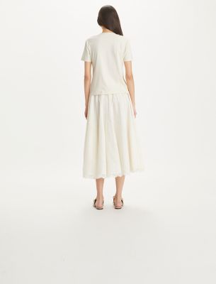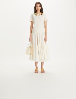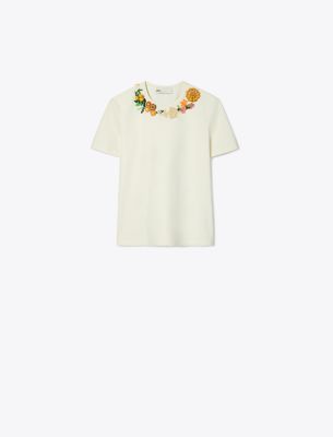 The classic cotton t-shirt embellished with embroidered flowers around the neckline. A timeless piece to wear tucked into the season’s denim and skirts.