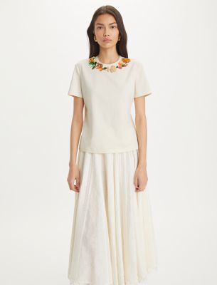 The classic cotton t-shirt embellished with embroidered flowers around the neckline. A timeless piece to wear tucked into the season’s denim and skirts.