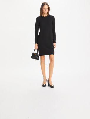 The sweater dress is knit from stretch wool that holds its shape for a flattering fit. Embellished with tonal sequins at the neckline for a touch of holiday sparkle.