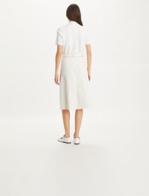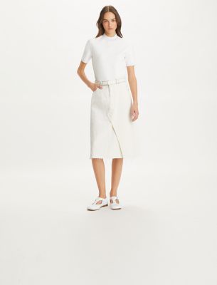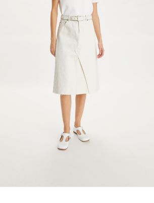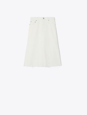 The classic denim A-line skirt is reimagined with the look of two jeans deconstructed and sewn together. Printed with tonal flowers, it is a versatile piece to dress up or down.