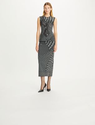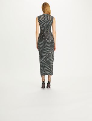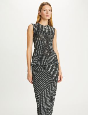From the Fall/Winter 2023 runway collection, which broke down traditional silhouettes and rebuilt them with an undone attitude. A fitted, sleeveless top, with patchwork of lace corsetry and a print that suggests classic menswear patterns.