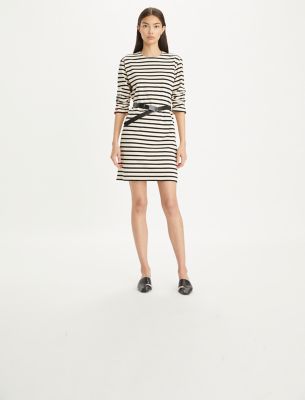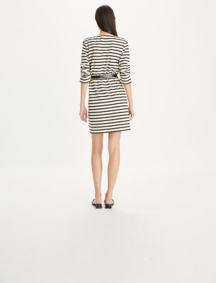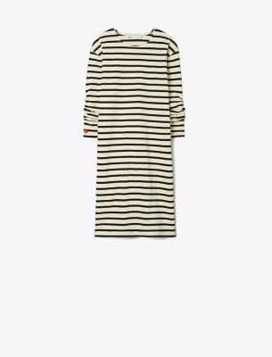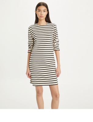 The striped cotton t-shirt dress is updated with perfectly pre-scrunched sleeves and a tiny embroidered flower on the left cuff. A timeless top to wear on its own or layered.