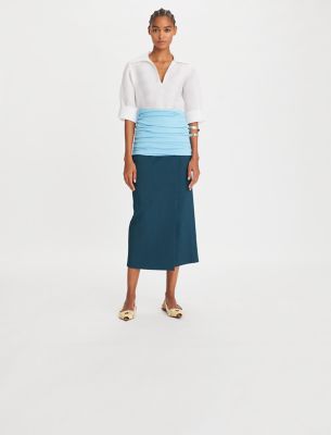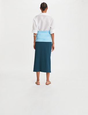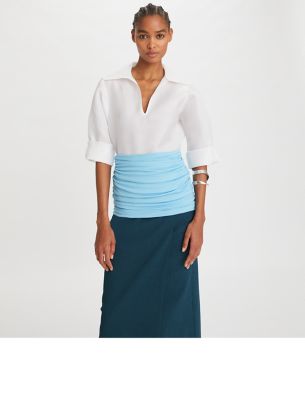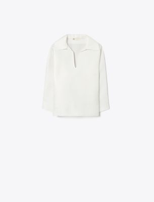 The new collection revisits signature pieces in luxurious materials for a modern perspective. One of the first silhouettes we ever designed, the tunic is updated for the season in lightweight Italian silk gazar with an open neckline. Wear the universally flattering top tucked into high-waist denim or with a ruched body-skimming skirt, as shown on the runway.