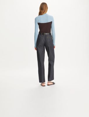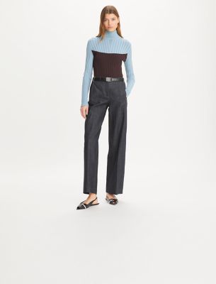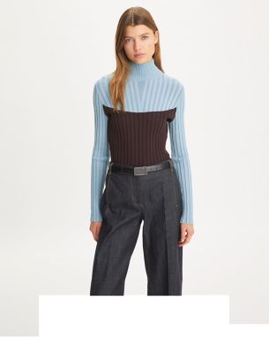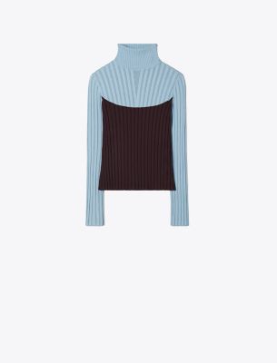 Ribbed viscose adds texture to the form-fitting turtleneck. Featuring dynamic colorblocks designed to mimic wearing two tops, the fall layer can dress down with jeans or up with trousers.